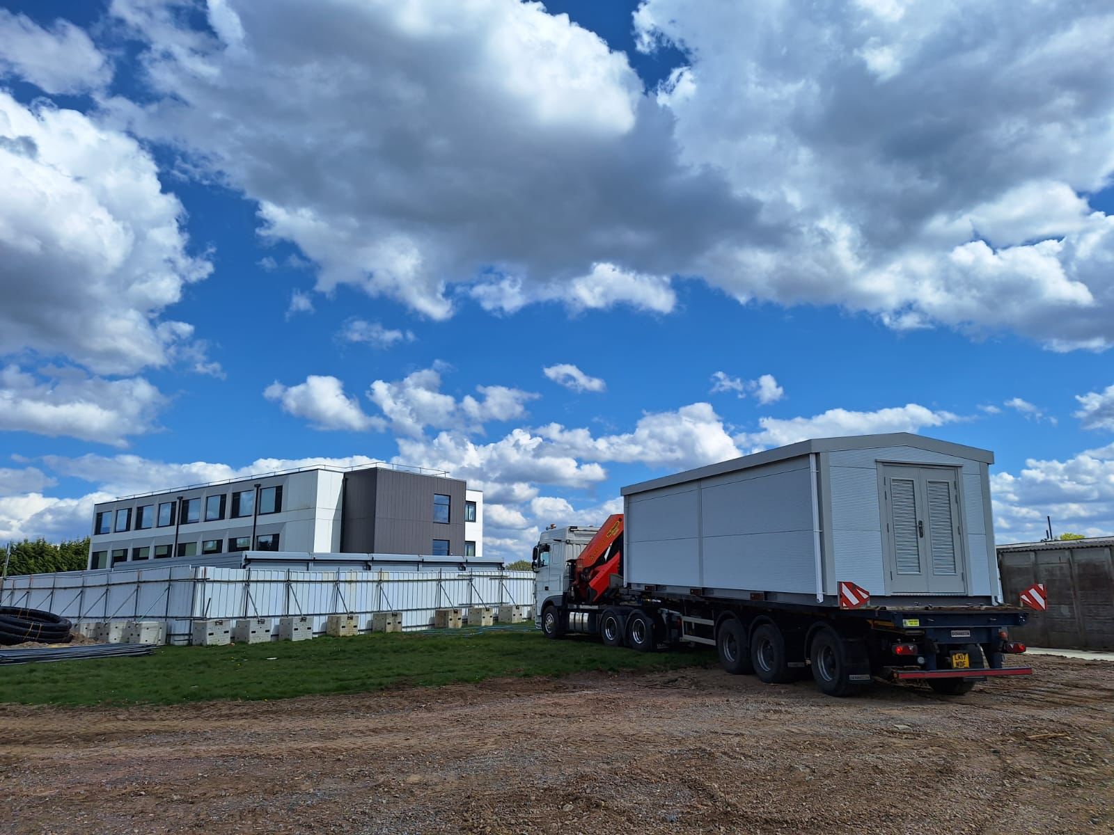 Obr. Kontejner s tepelnými čerpadly a všemi potřebnými prvky má rozměry vyhovující nákladní silniční přepravě
