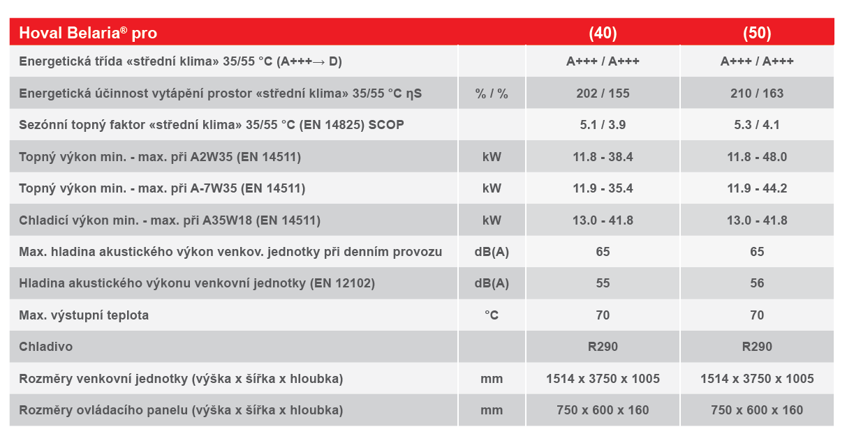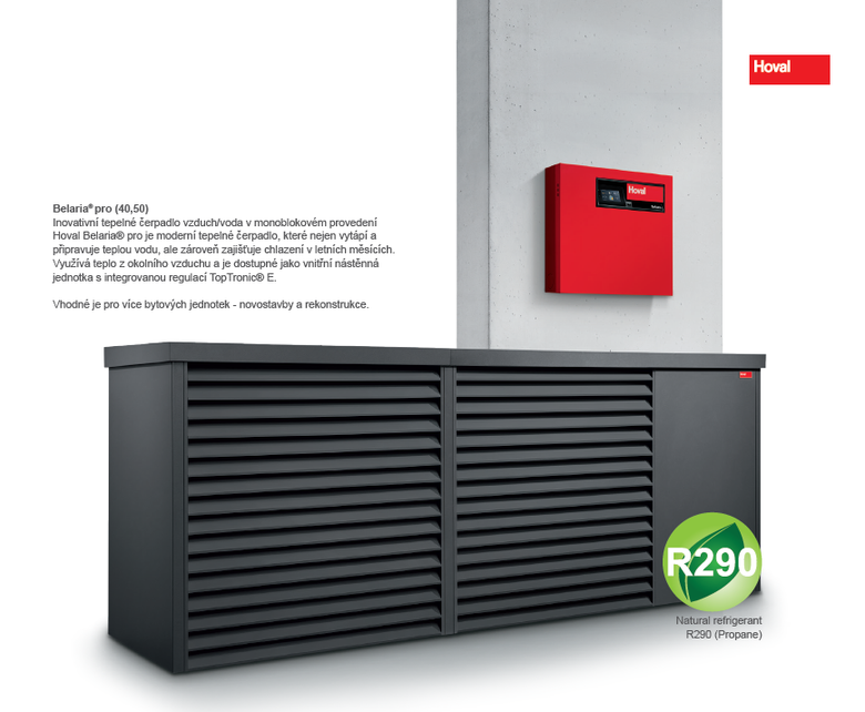 Společnost Hoval včas přešla na přírodní chladivo R290 (propan). S GWP (potenciál globálního oteplování) nižším než 3 představuje R290 ekologickou alternativu k syntetickým chladivům, jejichž GWP často přesahuje 2000. Díky vynikajícím termody¬namickým vlastnostem pracuje Belaria® pro (40, 50) efektivně – i při vysokých výstupních teplotách. Tím již dnes splňuje požadavky EU, které budou platné od roku 2027 pro ekologi¬cká monobloková tepelná čerpadla do 50 kW.