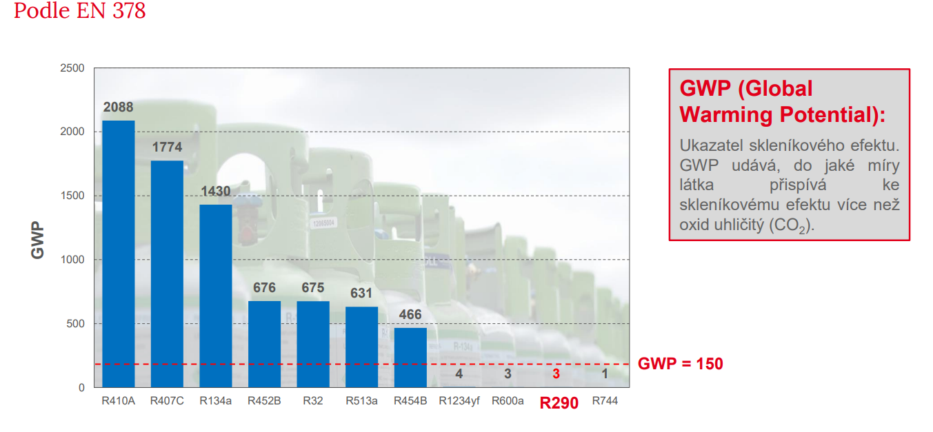 - Legislativní jistota – R290 s GWP 3 splňuje i nejpřísnější budoucí požadavky