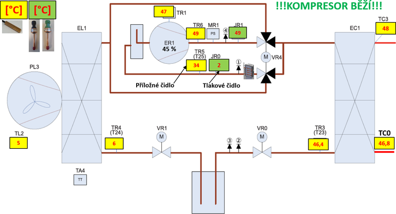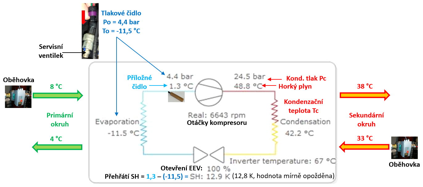 Na sání bylo dle interních čidel TČ obrovské přehřátí par chladiva TR5−JR0 = 32 Kelvin (jako když máme málo chladiva nebo EEV hodně škrtí průtok chladiva), ale vypařovací teplota JR0 byla pouhé 3 Kelviny pod teplotou vzduchu, takže na nedostatek chladiva nebo příliš škrcený EEV by to pak nevypadalo. Zároveň teplota horkého plynu TR6 na výtlaku kompresoru byla srovnaná s kondenzační teplotou JR1 na hodnotě 49 °C. Takže na sání to částečně vypadalo, že do kompresoru jde málo chladiva, ale na výtlaku to naopak vypadalo, že chladiva jde do kompresoru příliš, a tedy i částečně v kapalné formě. Výsledky rozdílů teplot na sání a výtlaku kompresoru šly v případě určení příčiny proti sobě.