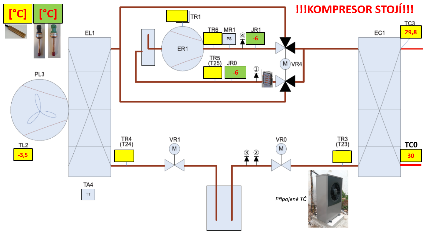 Hlavní nesoulad v porovnání se správnou činností TČ je však opět v tom, že kondenzační teplota JR1 je o téměř 6 K pod výstupní teplotou otopné vody TC3, i když otopná voda na kondenzátoru se ohřívá o běžných 7,8 K, tudíž je zde evidentně špatná náplň chladiva. A vše dotváří fakt, že horký plyn TR6 je nad výstupní teplotou otopné vody TC3 pouhých 7,5 K – tento rozdíl pro chladivo R410A má být minimálně 20 K.