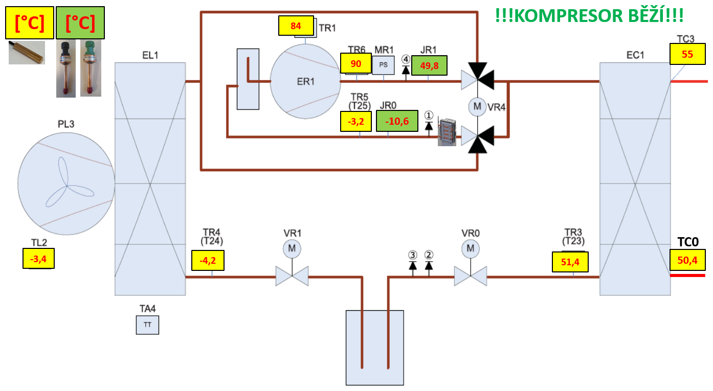 - Ačkoliv stroj pracuje s tlakově slabší směsí chladiva, tak v sání kompresoru se teploty nijak podezřele nejeví. Přehřátí TR5 − JR0 = 7,4 K je běžné a vypařovací teplota JR0 = −10,6 °C není nijak hluboko pod teplotou nasávaného vzduchu TL2 = −3,4 °C. Zde je tedy zřejmé, že sledovaní rozdílů teplot na nízkotlaké straně okruhu není pro identifikaci tlakově slabší směsi vždy ideální, a větší oporu tak máme v posouzení kladného rozdílu teplot TC3 − JR1.