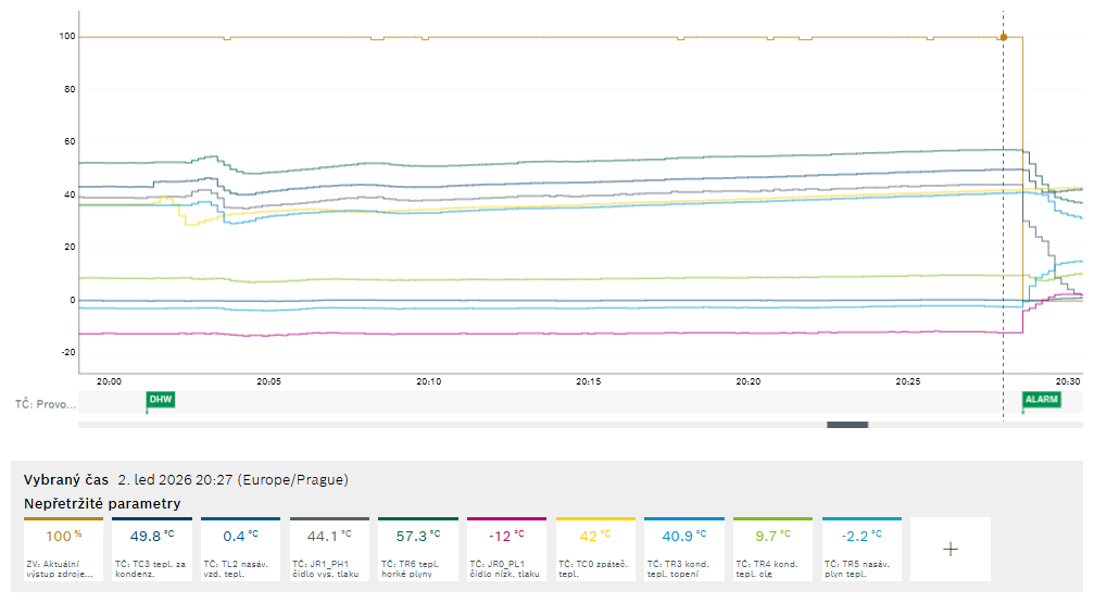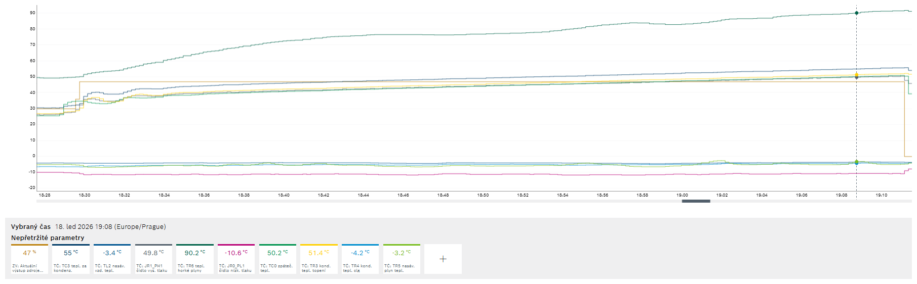 Pokud tedy máme horký plyn TR6 jen mírně nad výstupní teplotou otopné vody TC3, je to důkaz, že do kompresoru je nastřikována kapalina.