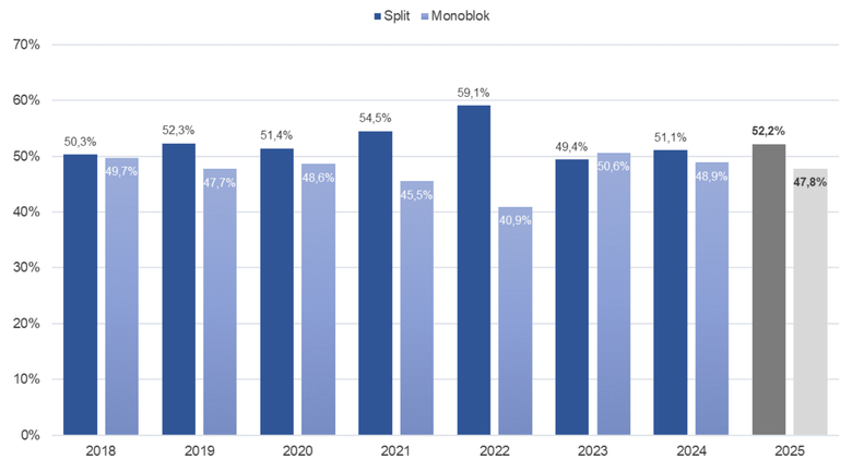 V roce 2025 zůstávají hodnoty na úrovni předcházejícího roku. Největší zastoupení ze všech kategorií mají tepelná čerpadla vzduch-voda, která se na celkových instalacích podílela 92 %. Poměr provedení split a monoblok byl 52 : 48.