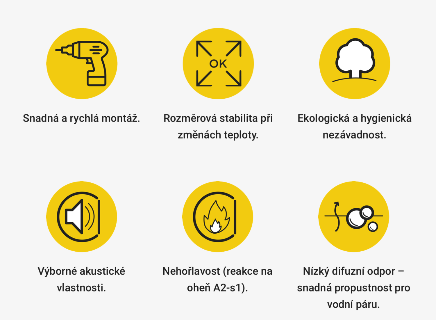 - Požární bezpečnost a trvanlivost – minerální vlna je nehořlavá (reakce na oheň A2-s1) a vykazuje vysokou tvarovou i mechanickou stabilitu.