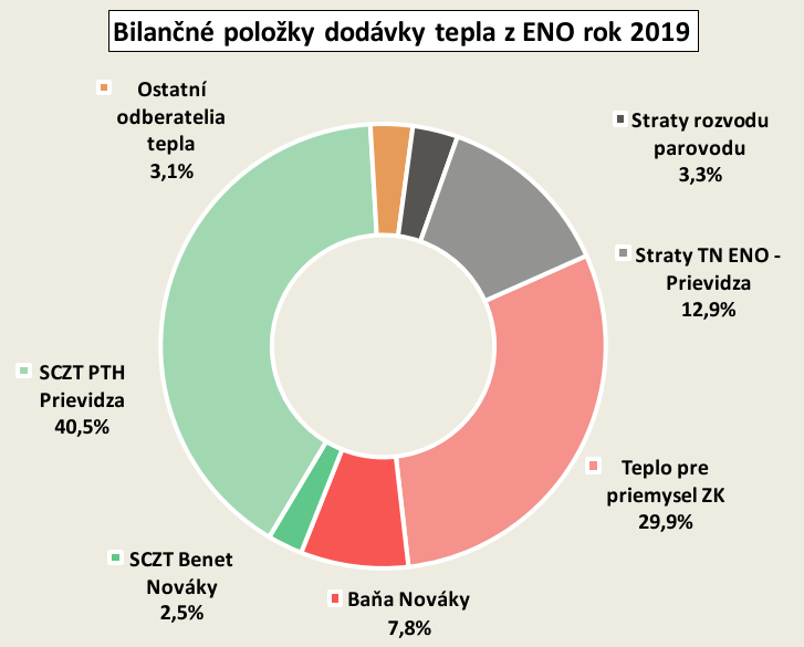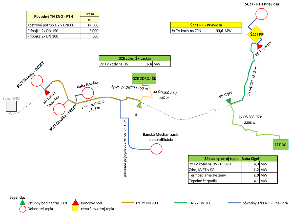 Zdrojom tepla pre oblasť Hornej Nitry bol zdroj KVET v ENO, pričom hlavnou činnosťou ENO bola výroba elektriny z domáceho uhlia pre ES SR. Výroba elektriny bola ekonomicky podporovaná ako VHZ SR. Celková ročná spotreba uhlia postupne klesala z 2,5 mil. ton, t.j. 7,0 TWh na 1,2 mil. ton, čo je menej ako 3,5 TWh PEZ. Výroba elektriny vo VHZ klesla v roku 2019 na úroveň 870 GWh/rok a celková dodávka tepla bola na úrovni cca 280 GWh, t.j. 1000 TJ/rok. V tom čase už bol stanovený termín ukončenia výroby elektriny vo VHZ z domáceho uhlia na 31.12.2023. V roku 2019 bola potreba tepla z SCZT v meste Prievidza 115 GWh (415 TJ/rok). Na obr. 1 sú položky dodávky tepla pre obyvateľstvo, priemysel a občiansku vybavenosť vo všetkých troch lokalitách. Priama dodávka tepla pre priemysel bola v pare, dodávka pre obyvateľstvo sa uskutočňovala v horúcej vode cez TN 2×DN200 z ENO do Zemianskych Kostolian. Hlavná vetva dodávky diaľkového tepla bola cez TN z ENO do 15 km vzdialenej Prievidze. TN zásoboval cca 1200 bytov v meste Nováky a 14 500 bytov v Prievidzi. Dimenzia TN bola 2×DN600 a dĺžka trasy 14,5 km. Prenosová schopnosť TN pri teplotnom spáde 150/70 °C bola 137,0 MW tepelných.