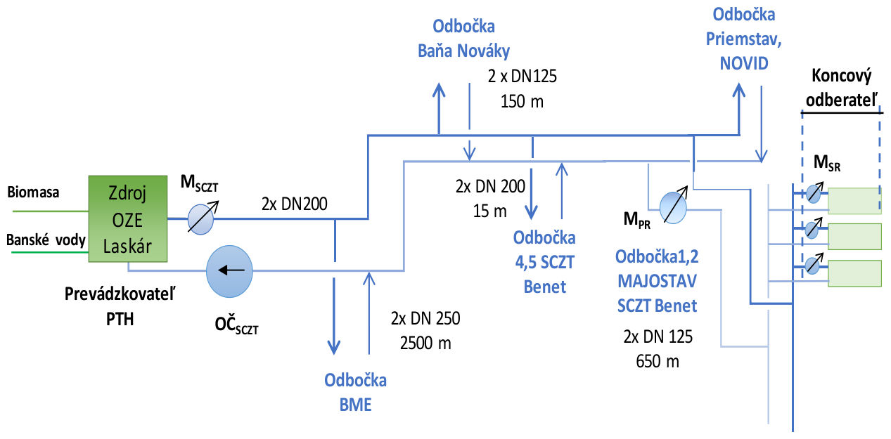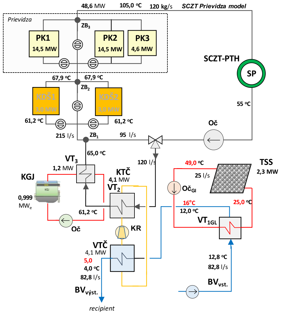 Principiálna schéma CZ tepla je na obr. 3. Zdroj je dimenzovaný na dodávku tepla pri výpočtovej teplote −14,0 °C zimamax.. Ročná potreba tepla na prahu SCZT v preberacom bode K1 (ZB3) je podľa klimatických podmienok 2021–2023 na úrovni 118,5 GWh/rok. Potreba tepla bola určená z podkladov PTH pri predpokladaných tepelných stratách RT cca 20,0 %.