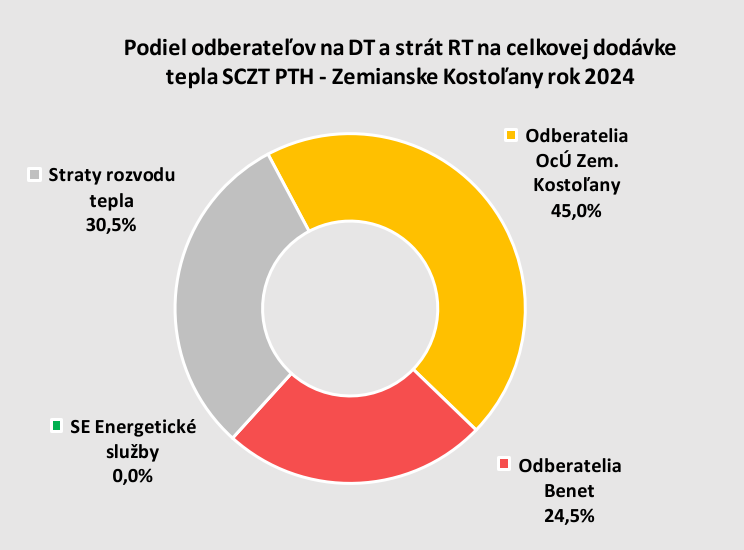 V obci Zemianske Kostoľany ako v jednej z mála obcí v SR sa dlhodobo rozvíja SCZT, bolo to najmä zásluhou Slovenských elektrární, ktoré v katastrálnom území obce prevádzkovali viac ako 80 rokov prvú systémovú elektráreň ENO. Odberateľmi tepla sú bytové spoločenstvá, OcÚ Zemianske Kostoľany, RD, v ktorých bývali aj mnohí zo zamestnancov ENO a organizácie, ktoré obchodovali s ENO, a subjekty občianskej vybavenosti vo vlastníctve SE. OcÚ mal eminentný záujem na zachovaní SCZT, aby sa to uskutočnilo, bolo potrebné vybudovať nielen CZ tepla, ale aj zrekonštruovať rozvody tepla, problémom je nízka dodávka tepla. Pôvodné položky dodávky tepla sú ako podiely odberateľov v roku 2019 na ľavom grafe obr. 8 a v roku 2024 na pravom grafe obr. 8. Z obrázkov je zrejmé, že „dočasne“ vypadol odber v objektoch SE, celková dodávka tepla sa znížila na polovicu a straty stúpli na trojnásobne. Je predpoklad, že DT do opustených objektov (ubytovne, sklady, ...) sa obnoví.