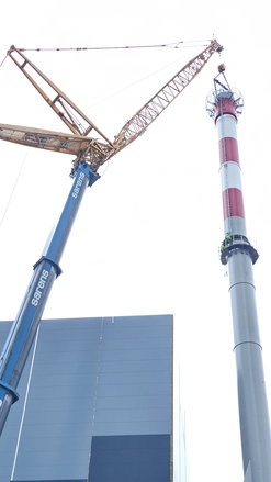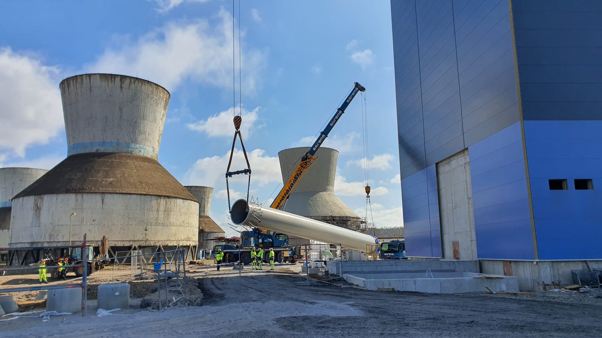 „Spodní část prvního komínového dílce uchopil pomocný jeřáb s nosností 100 tun, horní část hlavní jeřáb s nosností 500 tun a poté ho vyzdvihl do výšky tak, aby se přetočil z vodorovné do svislé polohy. Následovalo již samotné umístění do vybetonované patky. Podobným způsobem jsme v sobotu osazovali druhý dílec a v pondělí třetí. Před provedením zdvihů jsme museli části komína vystrojit žebříky, lávkami a hromosvodem. Samotné zdvihání sice vypadá spektakulárně, logisticky náročnější bylo však to, co tolik vidět není. Nadrozměrné závozy a průjezd až na staveniště jsme museli plánovat dlouho dopředu a pečlivě koordinovat na týdenní bázi,“ vysvětlil vedoucí projektu Tomáš Burian z Metrostavu CZ.
