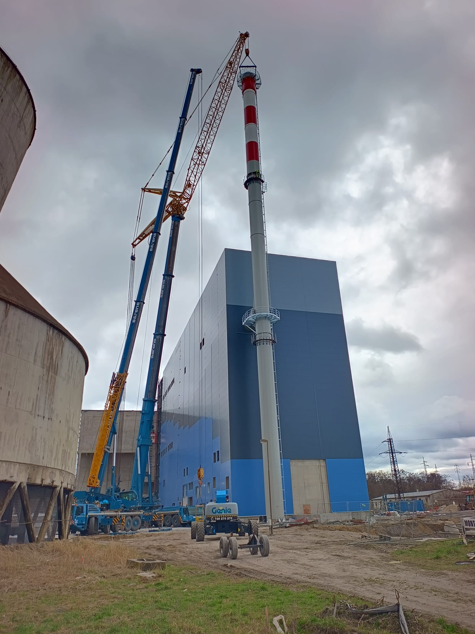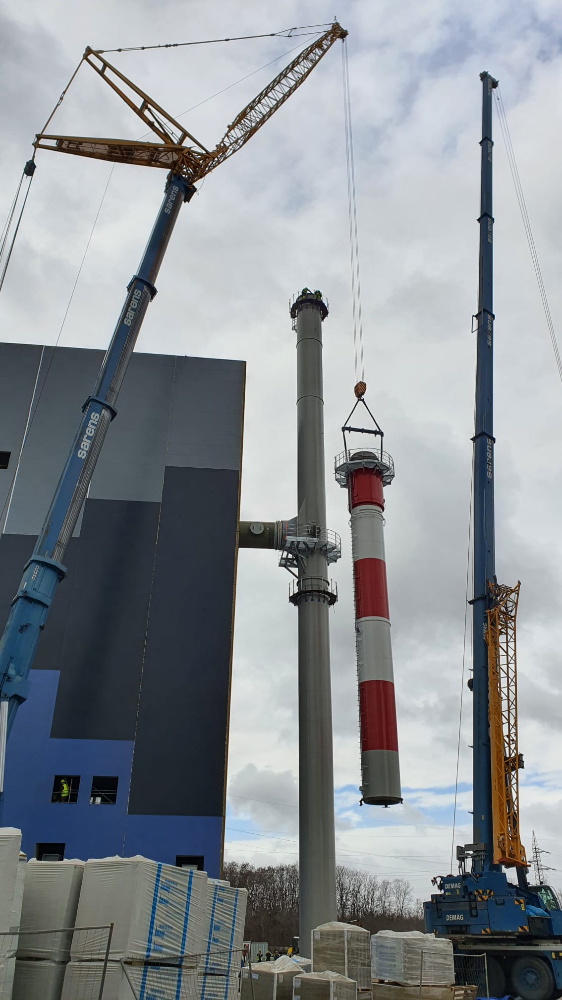 Jeřáby osadily komín pro novou teplárnu na odpad v Komořanech