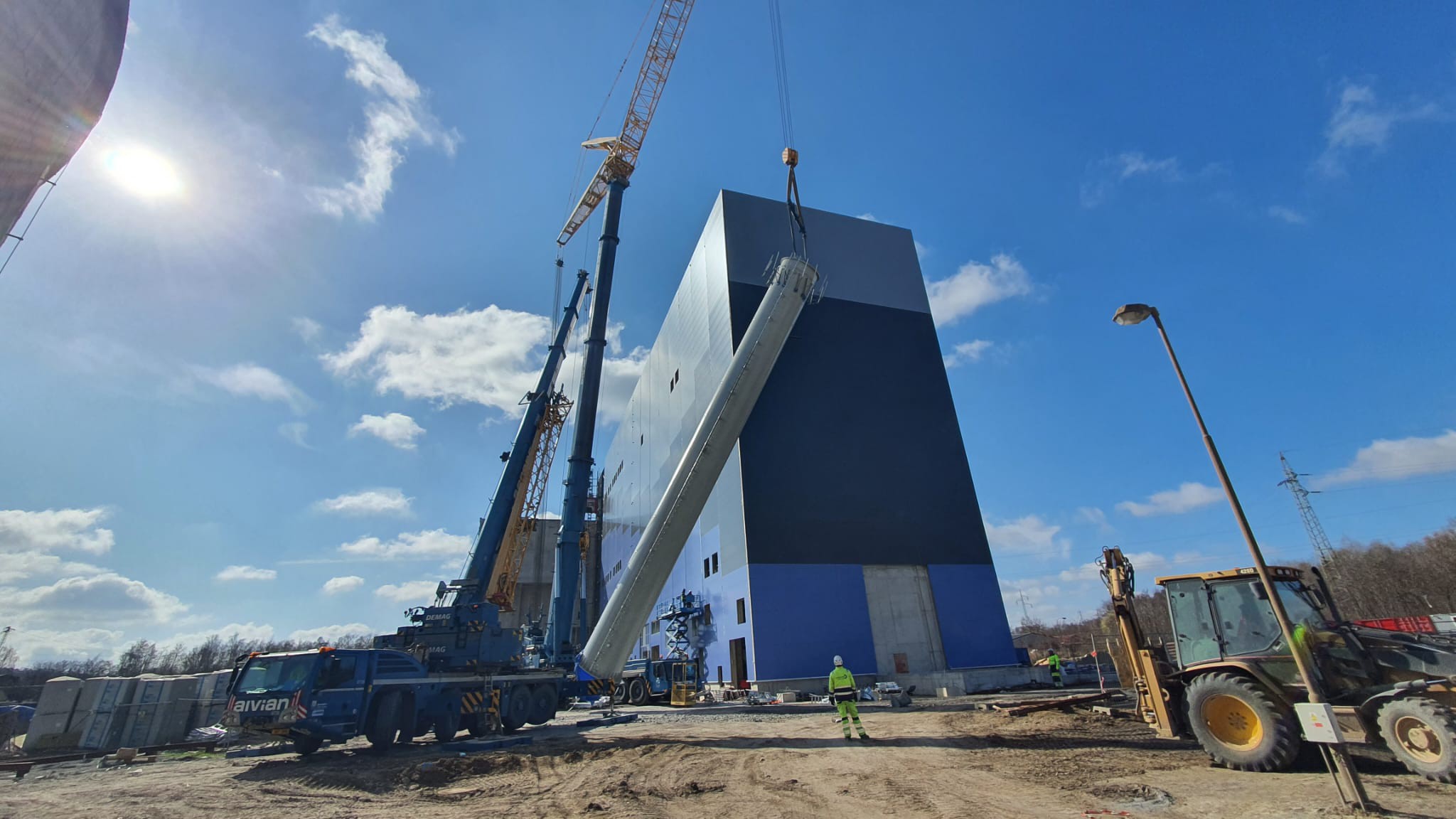 Stavbaři Metrostavu CZ dokončují nosné konstrukce i opláštění a zastřešení hlavního výrobního bloku, jehož součástí je kotelna, čištění spalin i bunkr odpadu. Vizuálně nejvděčnější fází však bylo aktuální osazování komína.