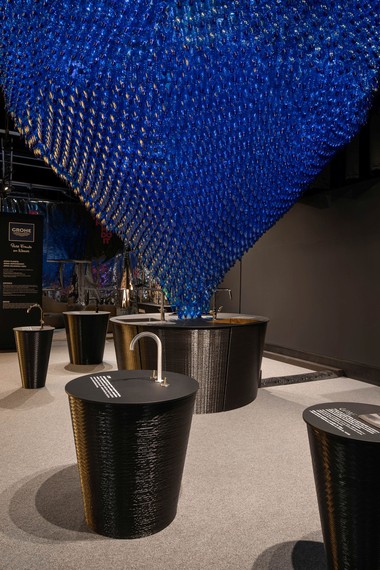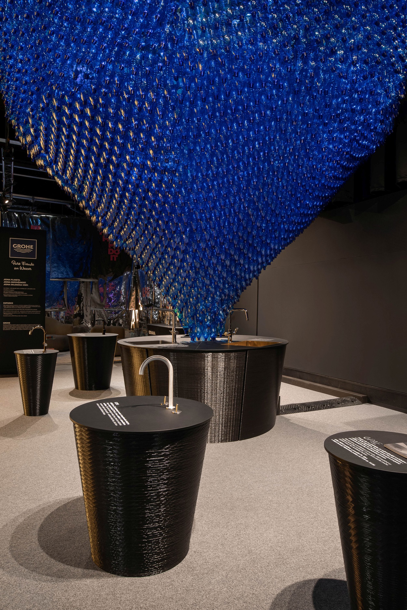 Instalace tvořená ze 3 600 recyklovaných PET lahví symbolizuje minulost – právě tolik lahví se totiž v České republice spotřebuje každých pět minut. Tento obraz postupně přechází do současnosti, kterou představují sokly z recyklovaného plastu. Budoucnost pak ztělesňuje technologie GROHE Blue – inovativní kuchyňské systémy poskytující filtrovanou, chlazenou i sycenou vodu přímo z kohoutku. Nabízejí chytrý způsob, jak s jejich pomocí lze omezit spotřebu plastů: čtyřčlenná domácnost díky nim může ušetřit až 800 lahví ročně a zároveň tak snížit spotřebu vody i produkci CO2 spojenou s jejich výrobou. Systém GROHE Blue si mohou návštěvníci na místě vyzkoušet a natočit si z něj neperlivou, jemně perlivou nebo perlivou vodu – jednoduché, ale silné gesto udržitelné budoucnosti.