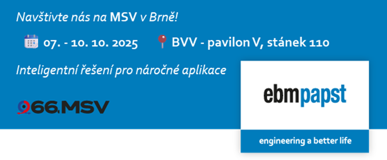 Srdečně vás zveme na Mezinárodní strojírenský veletrh (MSV), který se koná od 7. do 10. října 2025 na výstavišti v Brně. Rádi bychom vás přivítali na našem stánku, kde vám představíme naše novinky a produkty v oblasti ventilátorů, motorů a systémových řešení.