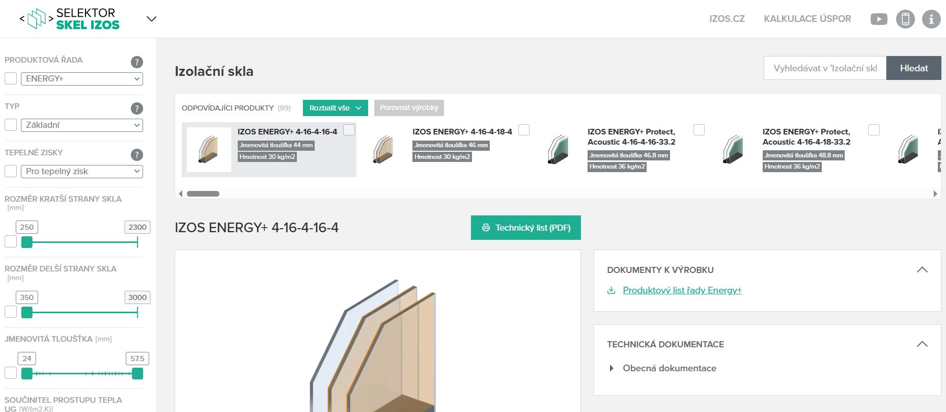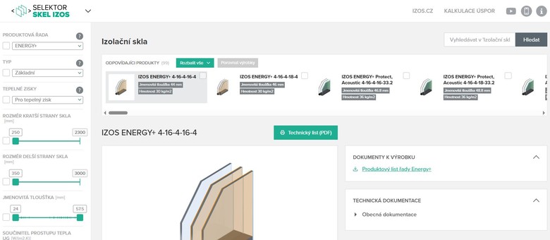 Selektor skel představuje propracovanou databázi zahrnující téměř sto typů izolačních skel IZOS. Data jsou průběžně aktualizována, což zajišťuje, že uživatelé pracují vždy s nejnovějšími technickými parametry. Díky intuitivnímu filtrování lze rychle vyhledat vhodné zasklení podle celé řady kritérií – od tradičně sledovaného součinitele prostupu tepla Ug až po světelnou propustnost, akustické vlastnosti, bezpečnostní parametry či energetické charakteristiky.