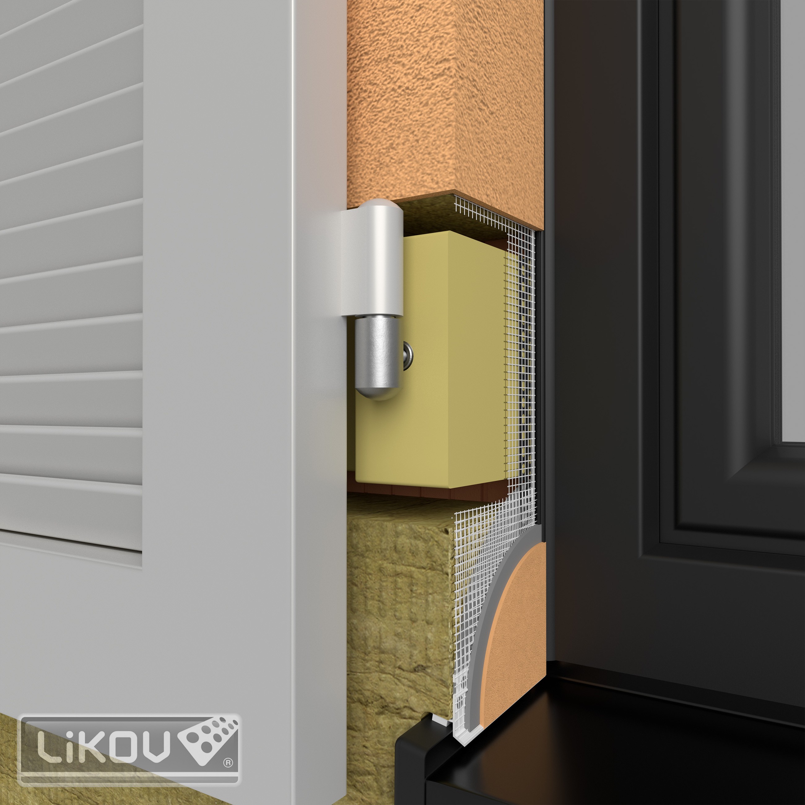 Příklad montáže závěsu pro okenice do prvku LIFIX L z čelní strany (při použití závrtné matice je spoj rozebíratelný)